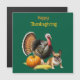 Unsere hübschen französischen Bulldoggen wünschen einen fröhlichen Thanksgiving Tag. Bulldogge mit einem großen Truthahn und Kürbis.
