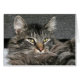 Gray Tabby Maine Coon Cat Mix Gesicht sieht aus diesem Foto Grußkarte, sein Kinn fast begraben in seiner Rüstung oder Mane.
