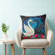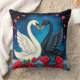 Zwei elegante, schwarze Schwäne, geschmückt mit einer Krone und einem Blumenkranz, sitzen ruhig auf einem ruhigen See, umgeben von einer lebendigen Flora unter dem strahlenden Vollmond und schaffen eine Szene von Romantik und Pracht.