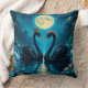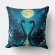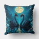 Zwei elegante, schwarze Schwäne, geschmückt mit einer Krone und einem Blumenkranz, sitzen ruhig auf einem ruhigen See, umgeben von einer lebendigen Flora unter dem strahlenden Vollmond und schaffen eine Szene von Romantik und Pracht.