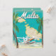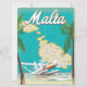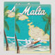 Malta Beach & Map Reiseplakat mit einem Meer Flugzeug Landung auf einem Strand und einer Karte der Insel.