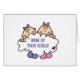 Unsere Mama der Doppelmädchen-T - Shirts, der Tassen, der Knöpfe, der Magneten, der Karten, der Taschentaschen und anderer Mama der Doppelmädcheneinzelteile kennzeichnet zwei entzückende Babys in den Rosa- und Lavendellagerschwellen, die eine Wolke halten, die "Mama der Doppelmädchen!" liest.