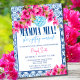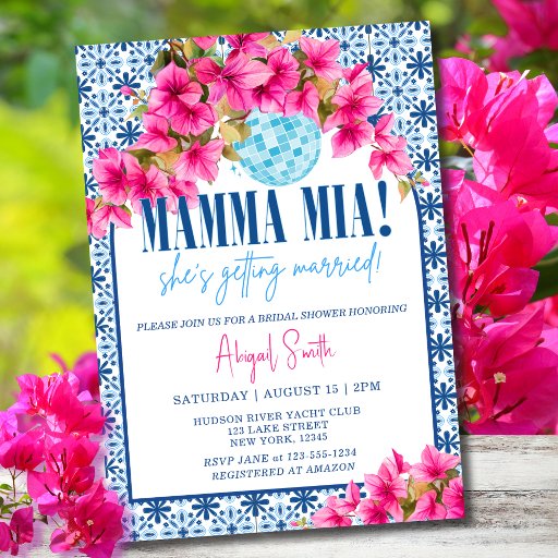 Bringe Sonnenschein und Glanz zu ihrem großen „Ja-Wort“ mit diesem lebendigen, von Mamma Mia inspirierten Thema für die Brautparty! Mit auffälligen rosa Bougainvillea-Blüten, einem schicken blauen Mittelmeer-Fliesenrand und einem Retro-Discolampen-Detail erfasst dieses Design perfekt die lustige, flirtende, am Meer stattfindende Feier-Stimmung.