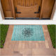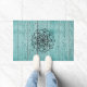 Schwarze, lineare Mandala-Grafik mit verwittertem blauem Holzhintergrund macht dies zu einer einladenden Matte für fast jeden