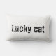 Rechteckiges Kissen mit Maneki neko verschiedener Farben auf weißem Hintergrund und Lucky cat-Aufschrift auf der Rückseite