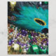 Foto von Mardi Gras Perlen und eine Federmaske. Die großen Perlen sind goldfarben, lila und grün gehalten, die Mardi Gras feiert.