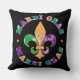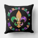 Ein farbenfroher Mardi Gras Quadrat Kissen in kräftigen Farben, die das Wort in leuchtend lila, grün und gelb