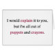 Mehrfache Produkte mit dem humorvollen Kommentar "ich würde ihn Ihnen erklären, aber aller ich bin aus Marionetten und Zeichenstiften heraus." auf ihnen.