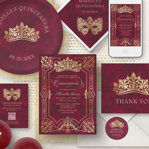 Fügen Sie Ihrem großen Tag ein wenig Maskerade Magie mit dieser eleganten Maske quinceañera Design! Mit seinen Farben, glänzenden Akzenten aus Glasfolien und dem barocken Stil zeichnet sich dieses Design durch Rätsel und Eleganz aus. Ideal für Ihre Maskerade oder Venezianische thematische Quinceañera Feier. Bestellen oder downloaden Sie noch heute und geben Sie Ihren Gästen die königliche Behandlung!