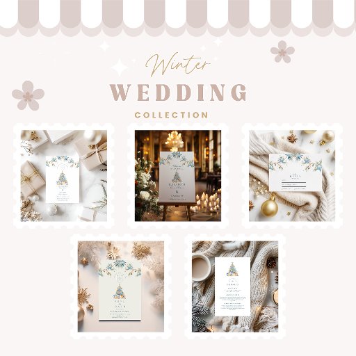 Dieses zarte Design besticht durch einen sanften Weihnachtsbaum in Aquarellen, der mit frostigen blauen Ornamenten und pastellfarbenen Geschenken geschmückt ist und von goldenen Kiefernästen und blauen Sternen gerahmt ist. Ein traumhafter und romantischer Ausflug in eine winterliche Hochzeitssaison - elegant, skurril und voller saisonalen Charme.