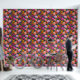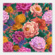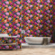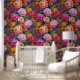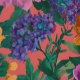Dieses fette Blumenmuster zeichnet sich durch dramatische lila, pfirsichgelbe und senfgelbe Blumen auf dunkelrosa Untergrund aus.