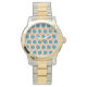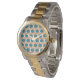 Diese Uhr hat ein modernes Design aus offenen orangefarbenen Kreisen, mit festen aquamarinen Kreisen, die durch das Muster laufen, mit aquamarinen vertikalen Linien und orangefarbenen horizontalen Linien.