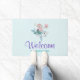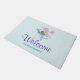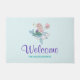 Begrüßungstürmatte mit einer bezaubernden Abbildung. Entworfen mit einer hübschen Meerjungfrau, die einen glücklichen Delphin reitet. Ein kleiner Quallenfreund begleitet sie. Dekoriert mit kleinen Spritzern von Imitaten Gold Glitzer. Hellblauer Hintergrund mit verblassten rosa Polka-Punkten.