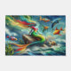 abstraktes Öl bemalt Aussehen mit einem Bild einer Meerjungflossen in rot und grün oben sitzend auf einem Felsen mit dem Ozean und fünf weiteren farbenfrohen topischen Fischen und Walen und Siegeln um sie herum mit einem blauen Himmel.grüne Algen schwimmend . Dieses Design zeichnet sich durch brillante Goldblitz-Farben und eine leistungsstarke Pose aus. Mit Tropfen darauf.