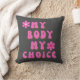 Mit diesem Kopfkissendesign, das den Text "my body my choice" in rosa Retro-Schriftart im Stil der 70er Jahre auf dunkelgrauem Hintergrund wiedergibt, unterstützen Sie die Grundrechte der Frauen.