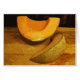 Diese Anmerkungskarte kennzeichnet Kunstphotographie von zwei Scheiben der goldenen orange Kantalupenmelonen. Sie sind, also luscious, kann der Saft auf dem hölzernen Schneidebrett gesehen werden. Die Beschaffenheitsmuster der grünen und gelben Rinden gegen das Gold und den braunen Ton tauchen plus die hölzerne Wand hinten schaffen eine interessante abstrakte Zusammensetzung der Farbe und sich bilden auf. Die ursprüngliche Fotografie ist digital erhöht worden, um die Gesamtstimmung dieses impressionistischen, künstlerischen Stilllebendruckes hervorzuheben.