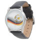 Klassische schwarze Lederrippenuhr mit grafischem Aufdruck einer Fußball-Kugel. Wählen Sie diese Uhr aus verschiedenen Stilen. Passen Sie diese Uhr an oder kaufen Sie, wie es ist.