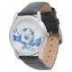 Klassische schwarze Lederrippenuhr mit grafischem Aufdruck einer Fußball-Kugel. Wählen Sie diese Uhr aus verschiedenen Stilen. Passen Sie diese Uhr an oder kaufen Sie, wie es ist.