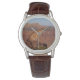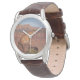 Die klassisch braune Lederrippenuhr wird mit einem Foto aus Wildlife Mountain Löwe gezeigt. Wählen Sie diese Uhr aus verschiedenen Stilen. Passen Sie diese Uhr an oder kaufen Sie, wie es ist. Bild