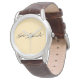 Herrenklassische braune Ledergitter-Armbanduhr mit Signatur Stellen Sie sich eine Uhr vor, die ein Zeugnis der Zeit und ein Spiegelbild Ihres Stils ist. Die Men's Classic Brown Leather Strap Watch, die mit meiner Unterschrift geschmückt und mit einem hellpastellgelben Gesicht versehen ist. Diese Uhr ist für den modernen Mann konzipiert, der Eleganz und zeitlose Eleganz schätzt. Warum sollten Sie diese Uhr wählen? Jeder Mensch verdient ein Zeitmesser, der nicht nur die Zeit, sondern auch eine Geschichte erzählt - Ihre Geschichte. Lass diese Uhr als Teil deiner Reise und markiert jeden Augenblick elegant und präzise. Mit dieser klassischen Herrenuhr können Sie Ihre Kleidungskollektion erweitern, einen bleibenden Eindruck hinterlassen und die perfekte Mischung aus Mode und Funktionalität annehmen.