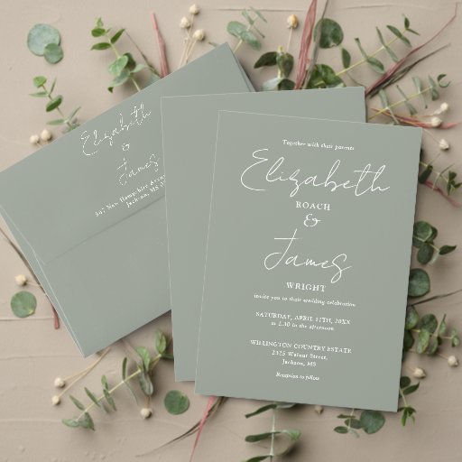 Simple Sage Green Script Wedding Invitation SuiteDesignt von Pure Piglet Designs