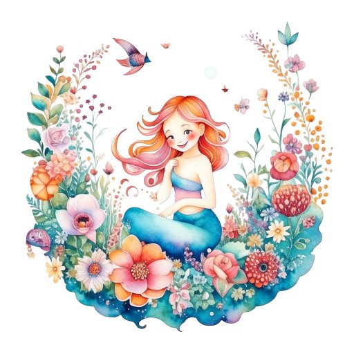 Eine hübsche kleine Meerjungfrau in einem Bett von Blume Aquarell Illustration Mädchen personalisiert Geburtstag Mädchen-Taste. Die Farben sind rosa, korallenfarben, orange, gelb und blau.
