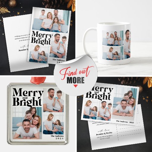 Mit dieser modernen und stilvollen Foto-Collage-Karte erleben Sie den Zauber Ihres Familienweihs. Mit einem kühnen, grafischen Design und einem fröhlichen "fröhlichen und hellen" Gefühl ist diese Karte ideal, um die Liebe und Freude Ihrer Familie in dieser Feriensaison zu zeigen. Personalisieren Sie es mit Ihren Lieblings-Fotos, Namen und Nachrichten für einen wirklich einzigartigen und unvergesslichen Weihnachtsgrüßen.
