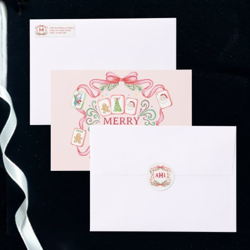 This chic design features a ribbon frame with mahjong tiles and a phrase that says "merry mahjong."