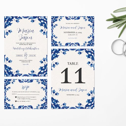 Dieses mexikanische Blue Floral Elegant Fiesta Wedding Save the Date Design verfügt über zarte blaue Blumenmotive und wirbelnde Motive, die von der traditionellen mexikanischen Talavera Töpferei inspiriert und elegant in den Ecken angeordnet sind. Die tiefblauen Farbtöne kontrastieren wunderschön mit dem weichen, strukturierten, weißen Hintergrund und schaffen ein sauberes und raffiniertes Aussehen. Dieses Design eignet sich ideal für Hochzeitsfeiern oder feierliche Feierlichkeiten. Freuen Sie sich auf eine Touch von kulturellem Charme und zeitloser Eleganz.
