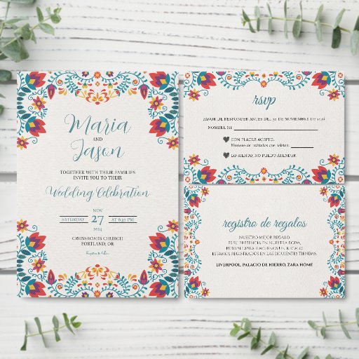 Dieses mexikanische Fiesta Elegant Colorful Floral Wedding Invitation präsentiert lebendige, folkloristische Blumenmuster in fett roten, Tees, Gelbtönen und Purples, inspiriert von traditioneller mexikanischer Kunst. Set vor einem texturierten cremefarbenen Hintergrund verbindet mexikanischer Kulturreichtum mit eleganten, zeitgenössischen Details für eine festliche und stilvolle Feier.