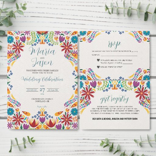 Dieses mexikanische Nuestra Boda Blume Botanische Hochzeit Save the Date Design präsentiert ein reichhaltiges und lebendiges Blumenmuster an den Rändern, mit kühnen Farben wie Rot, Orange, Blau, lila und Gelb, die ein festliches und einladendes Ambiente schaffen. Die Blume werden mit grünen Mustern und kleinen, detaillierten Verzierungen kombiniert und verleihen dem Design ein lebendiges und strukturiertes Aussehen. Das Gleichgewicht der hellen, kontrastreichen Farben und die zarte, symmetrische Anordnung machen dies zu einer auffälligen Option für eine feierliche Hochzeitsfeier, vor allem eines mit traditionellem oder folkloristischem Thema.