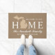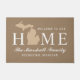 Stylish "Welcome to our home" doormat features a typography design with state of Michigan map. Personalize with your family's last name monogram and your city name. Includes a burlap background layer with a rustic textured appearance. Neutral tan, beige, and white colors.