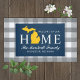 Das stilvolle Doormat "Welcome to our Zuhause" zeichnet sich durch ein typografisches Design mit Staat der Michigan-Karte aus. Personalisieren Sie die Monografie Ihres Familiennamen und den Namen Ihrer Stadt. Die Farben Navy Blau, Maisgelb und Weiß können individuell angepasst werden.