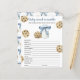 Ein kleiner Keks ist unterwegs! Party mit Duschkabine. Aquarellkekse mit Schokolade und Flaschenmilch mit blauem Bogen. Antworten: KREISE, KREUZEN, SCHNULLER, FLASCHE, NACHTLICHT, LULLABY, STROLLER, EPIDURAL, BURP, HOCHSTUHL, DIAPER BAG, SCHWIMMBAD