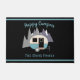 Dieses Thema des Campers ist für Sie bereit, mit Ihrem eigenen Namen und Gruß zu personalisieren. Erstellt mit einem niedlichen Mini-Trailer Bild in cremeweiß und aqua blau gegen graue schneebedeckte Berge auf schwarzem Hintergrund. Gutes Geschenk für Hütte- oder Wohnungsfamilien.