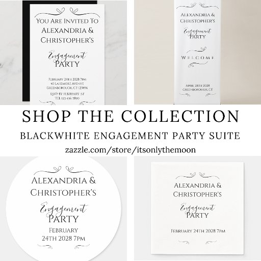 Minimal black and white engagement party invitation. Featuring an elegant script and classic design, it's perfect for inviting your guests to your engagement party. Contact the designer for help with personalization and customization.