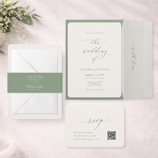 This elegant wedding details card features a refined minimalist design with soft sage green typography on a warm ivory background. Clean layout and graceful script headings create a timeless look that pairs beautifully with modern, classic, and garden-style weddings.