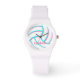 Die sportliche Armbanduhr zum Thema Volleyball für Mädchen ist mit einer einfachen, minimalistischen Grafik ausgestattet (die nur die türkisfarbenen und rosa Nähte des Volleyballs zeigt), die sich auf weißem Hintergrund leicht auseinander setzen - mit ihrem Namen - von katz_d_zynes