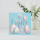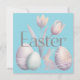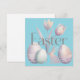 A sophisticated and minimalist digital illustration featuring the word "Easter" in a clean, grey serif font. The text is layered over a soft watercolor arrangement of tulips, patterned Easter eggs, and a small bunny silhouette. The color palette is muted with lavender, sage, and dusty rose tones.