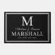 Moderne personalisierte Schwarz-Weiß-Großtür-Matte mit Vornamen der Paare in einer Kalligraphie-Schrift, Monogramm des Nachnamens, vollständiger Nachname und Hochzeitstermin, erhältlich in individuell anpassbaren Vorlagen. Ein stilvolles, elegantes Geschenk oder ein neues Zuhause-Geschenk für Braut und Bräutigam mit individueller persönlicher Touch.