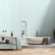 Mint green vertical stripes with a subtle linen texture, ideal for light coastal interiors and breezy summer styling.