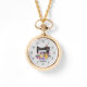 Eine nähende thematische Halskette-Uhr bereit, um mit ihrem Namen personalisiert zu sein. Bedruckt mit einer Vintagen, schwarzen Nähmaschine, die mit einem üppigen Bouquet aus gemischten pastellfarbenen Blume in Aquarellfarbe Akzent gesetzt ist. Editieren Sie den Namenstext einfach in der Schaltfläche "Personalisieren". Ihre Wahl von Gold oder Silber.