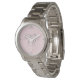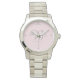 Die Armbanduhr von Pageant in Silver-Ton-Farbtönen ist mit einer kleinen silbergrauen Krone um 12:00 Uhr, einem rosa Schwarz-Rosa-Gesicht mit grauen Zeitmarkierungen und drei personalisierten Monogrammen in extravaganter Schrift ausgestattet. Hat eine präformatierte Titelzeile unter den für Ihre Personalisierung gewartet Monogrammen. Passen Sie diese Uhr weiter an und wählen Sie einen anderen Stil, Farben usw.
