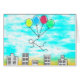 Cartoon Charakter mit Ballons über die Stadt fliegen. Digitales Bild.