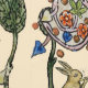 Medieval bestiary spiel musikalische instrumente.Three Owls and Concert of Rabbits.Digital collage by Bulgan Lumini ©