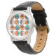 Diese Uhr hat ein modernes Design von Halbkreisen in aquamarin und orange mit einer halben Sternexplosion in einigen und winzigen Wiederholkreisen in anderen.