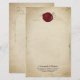 Dieses maßgeschneiderte, stationäre Papier zeichnet sich durch ein historisches mittelalterliches Thema aus. Der Hintergrund ist ein verblasstes Pergamentpapier-Design, das einer mittelalterlichen Schriftrolle ähnelt. Ein verzierter Goldrahmen grenzt an das Papier. Oben wird ein Siegel mit rotem Wachs platziert, wobei eine Probe anfänglich verwendet wird. Ein Beispielname und eine Adresse werden in der unteren Ecke gedruckt. Sie können den stationären Text personalisieren, um Ihren eigenen Anfangstext und Ihren eigenen Text einzubinden.