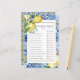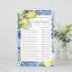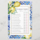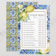 Dieses elegante Brautparty "raten Sie, wer Braut oder Bräutigam?" Brautparty-Spielkarte weist einen weißen Hintergrund mit blauen mediterranen Fliesen, Blume und Zitronen/Zitrusfrüchten in Aquarell auf. Personalisieren Sie es für Ihre Bedürfnisse. In meinem Geschäft finden Sie passende Produkte.