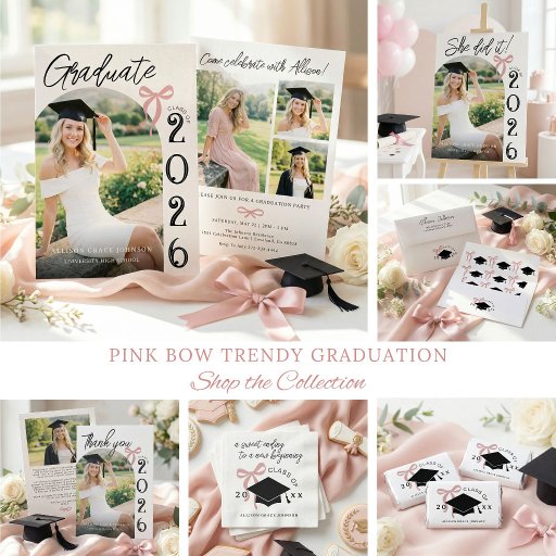 Celebrate her incredible achievement with this personalized graduation invitation for the Class of 2026, featuring the word “Graduate” in modern script typography. Designed with a white background, delicate pink bow bow accent, and elegant vertical class year layout, this invitation is perfect for highlighting a confident, accomplished graduate.