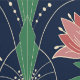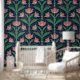 Modern Art Deco style wallpaper with symmetrical red tulip flowers on a navy blue background for a timeless classical look of your home